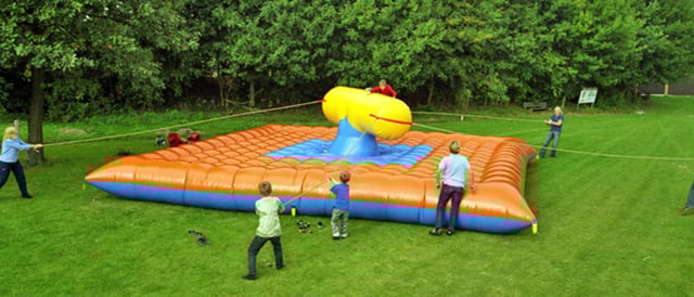 Das Pull-Riding besteht aus einer sehr weichen, aufgeblasenen Fläche, auf der sich ein stilisierter Bulle befindet – ein wackeliges T.